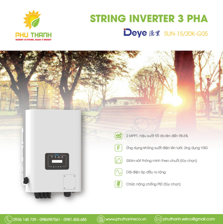 SUN-20K-G05 phù hợp với hệ thống điện mặt trời dân dụng và thương mại. Sản phẩm giúp giảm chi phí điện, tối ưu hóa năng lượng tái tạo và đảm bảo nguồn điện ổn định. Với thiết kế chắc chắn, công nghệ hiện đại và khả năng giám sát thông minh, đây là lựa chọn lý tưởng cho các hệ thống điện mặt trời 3 pha.