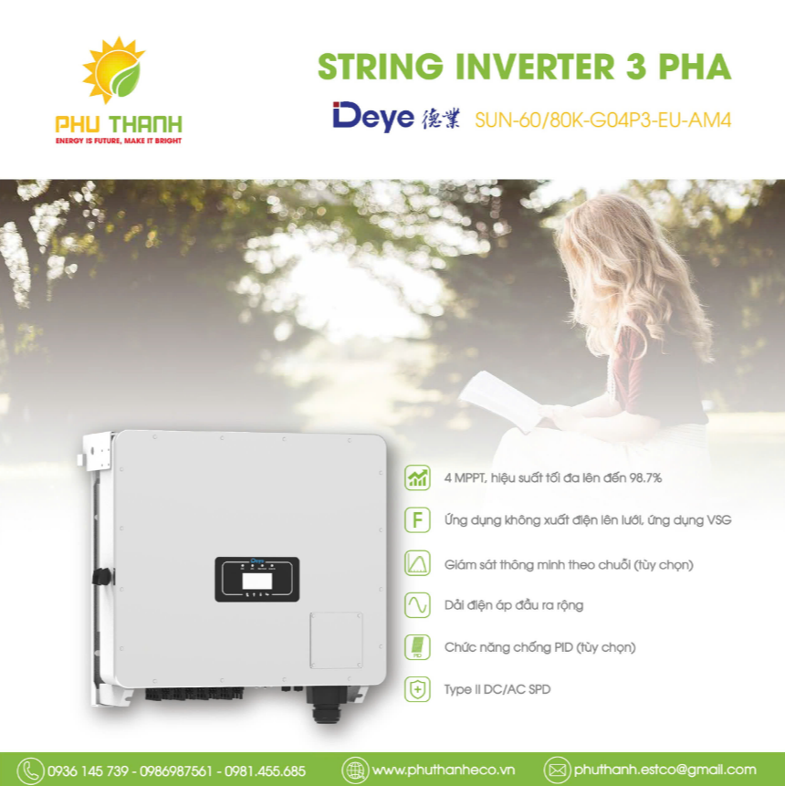 Biến tần Deye SUN-80K-G04P3-EU-AM4 phù hợp với nhà máy, khu công nghiệp, trang trại điện mặt trời. Sản phẩm giúp giảm chi phí tiền điện, tận dụng tối đa năng lượng tái tạo và giảm phụ thuộc vào lưới điện quốc gia. Đây là lựa chọn tối ưu cho các hệ thống điện mặt trời quy mô lớn, mang lại hiệu suất cao và độ tin cậy dài lâu.