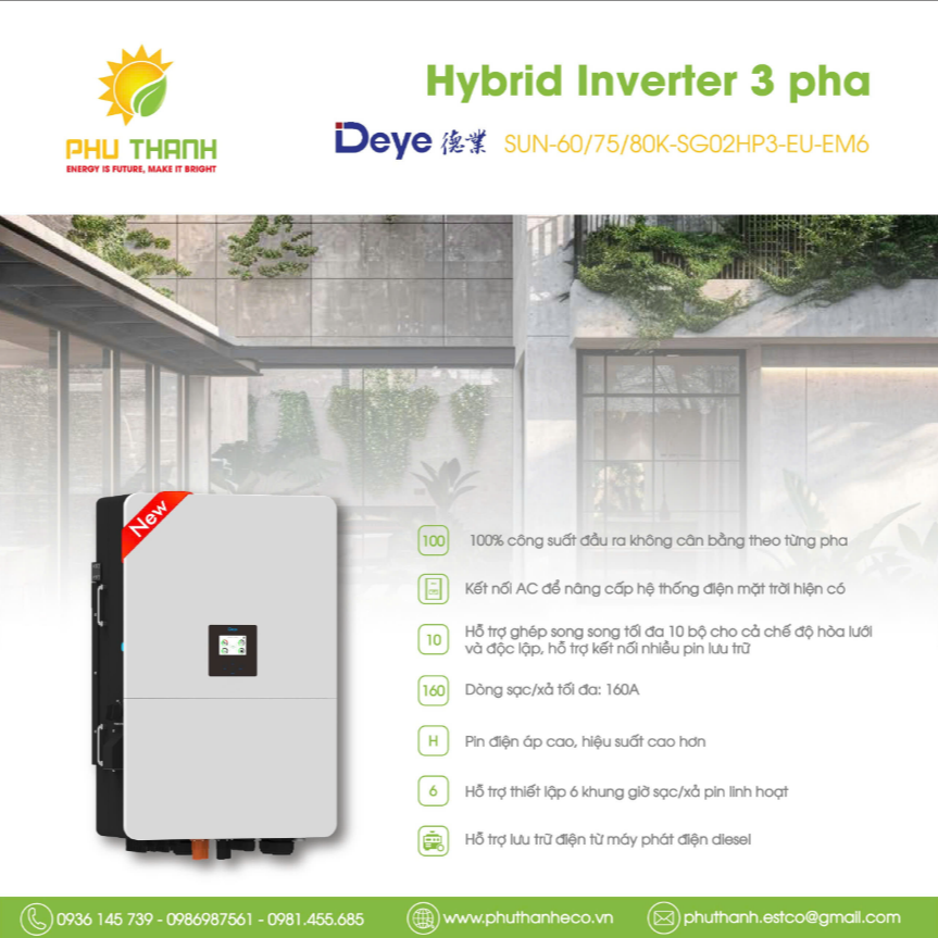 DEYE SUN-75K-SG02HP3-EU-EM6 là biến tần hybrid công suất lớn 75kW. Sản phẩm phù hợp cho hệ thống điện mặt trời công nghiệp và thương mại. Công nghệ tiên tiến giúp tối ưu năng lượng, giảm chi phí vận hành và đảm bảo nguồn điện ổn định.