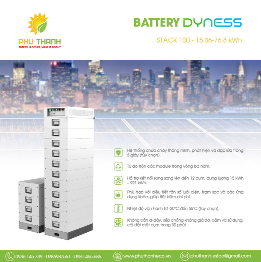 Dyness Stack 100 là giải pháp pin lưu trữ mở rộng linh hoạt, cho phép nâng cấp dung lượng từ 15.36kWh đến 76.8kWh, sử dụng cell LiFePO4 bền bỉ, an toàn, phù hợp cho hệ thống điện mặt trời quy mô vừa và lớn.
